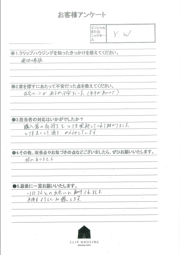 Y.W様 この度は物件をご購入いただき、誠にありがとうございます。また、アンケートにご協力くださり、重ねてお礼申し上げます。ご希望の物件が良いタイミングでご紹介できたこと、大変嬉しく思っております。気持ちを理解してくれたとのお言葉もうれしい限りです。今後も住宅に関して何かお困り事がございましたら、「川口」までお気軽にご連絡ください!引き続き、どうぞ宜しくお願いいたします(^^) 担当者より